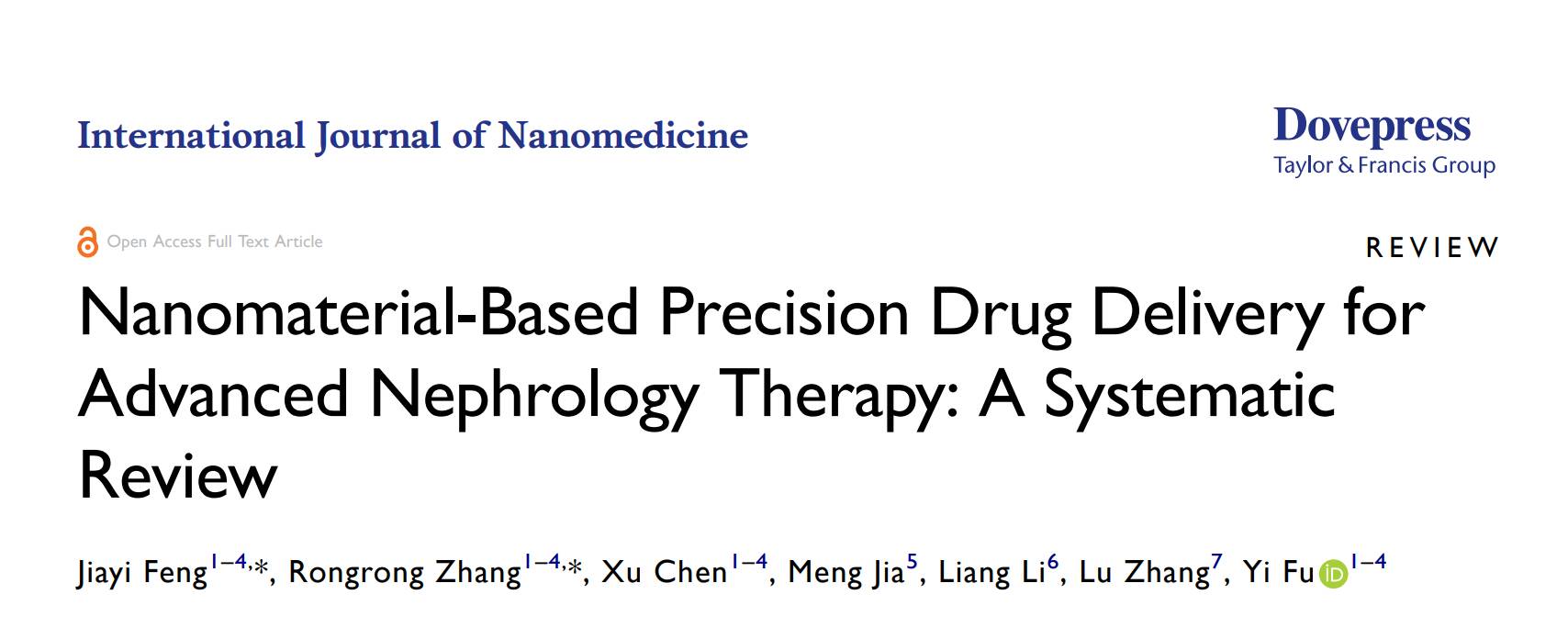 2026年3月,山东第一医科大学生物医学科学学院付艺团队联合厦门大学附属心血管病医院、美国宾夕法尼亚大学等单位研究人员,在 International Journal of Nanomedicine(IF=6.5,中科院医学2区、JCR Q1)发表题为“Nanomaterial-Based Precision Drug Delivery for Advanced Nephrology Therapy: A Systematic Review”的综述文章,系统总结了纳米材料在肾脏疾病精准治疗与诊断中的研究进展。生物医学科学学院2023级生物医学科学本科生冯荚懿(泰山班)、张蓉蓉为共同第一作者,生物医学科学学院付艺副教授和厦门大学附属心血管病医院心内科张璐医生为共同通讯作者,山东第一医科大学为第一作者单位。