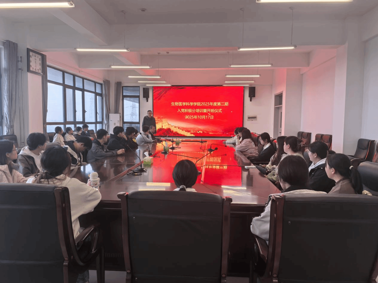 近日,生物医学科学学院本科生党支部2025年度第二期入党积极分子培训的开班仪式在学院A518会议室隆重举行。学院党委副书记曹广祥、本科生党支部书记张一航、本科生辅导员以及全体入党积极分子出席开班仪式。