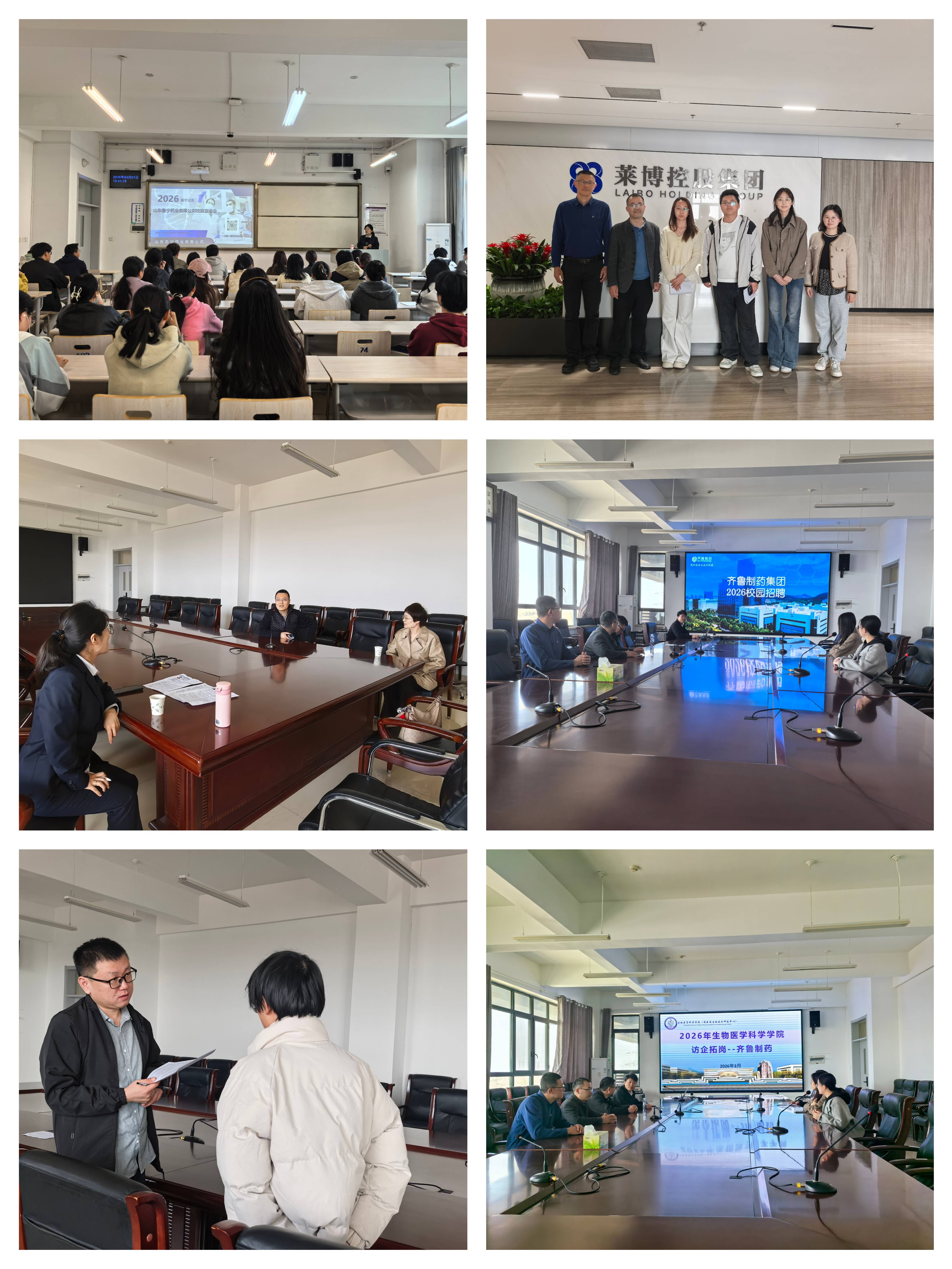 辅导员带领学生前往莱博集团开展访企拓岗,实地考察企业发展情况,深入对接岗位需求与人才培养合作事宜;同时邀请齐鲁制药、鲁宁药业两家企业来院举办招聘宣讲会,企业HR负责人详细介绍了公司概况、岗位需求及职业发展前景,现场开展简历投递、面试交流等环节,为同学们提供了面对面沟通、零距离求职的便利条件,有效助力毕业生精准择业。